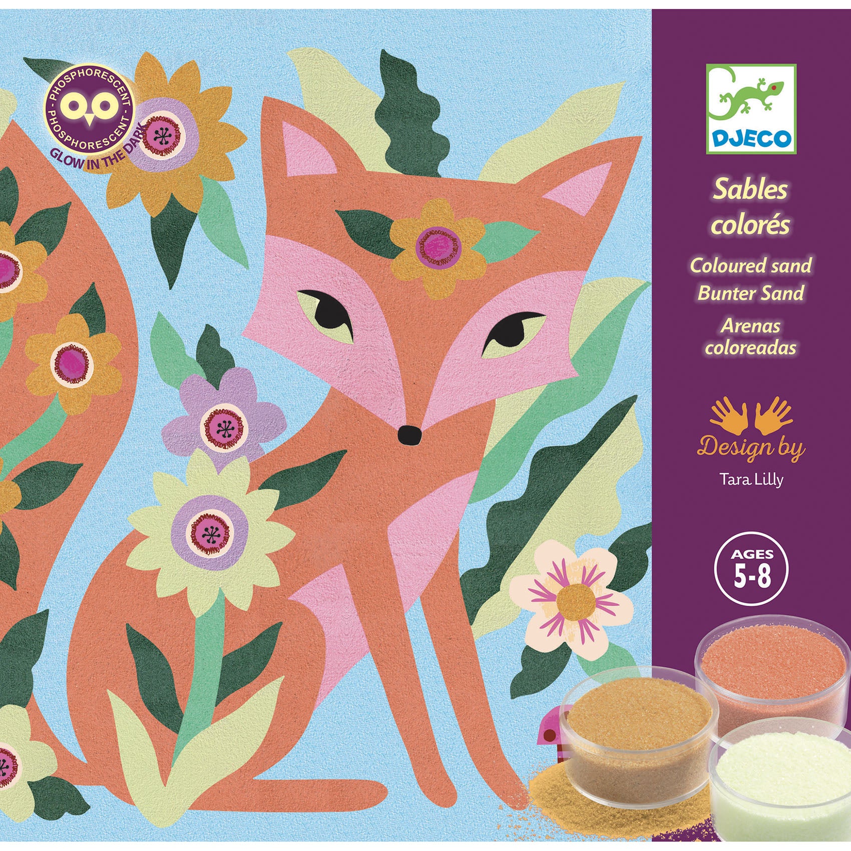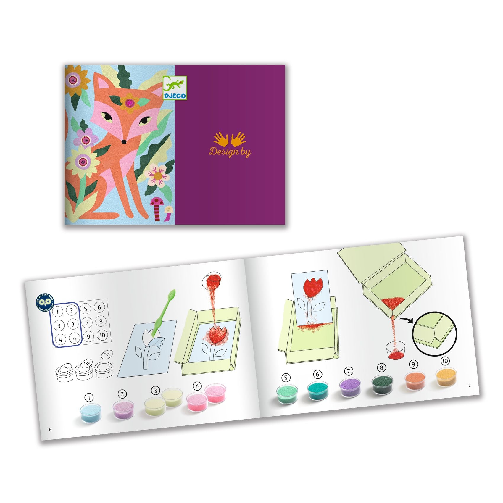 Djeco által készített, okos eszköz van a készletben a ragasztott részek egyszerű eltávolításához. Tiszta tevékenység: mert a gyermek a dobozban dolgozik, így nem szóródik szét a homok. Ez egy okos készlet, mert a dobozban van egy kis lyuk, ahol kiönthető a felesleges homok és széles szájú edényekbe önthető. Van jó tárolódoboz, rugalmas záródással az anyag tárolására, ha a tevékenység véget ért. A készletben egy magyarázó füzet is található, amely lépésről lépésre részletezi, hogyan lehet homokképet készíteni.