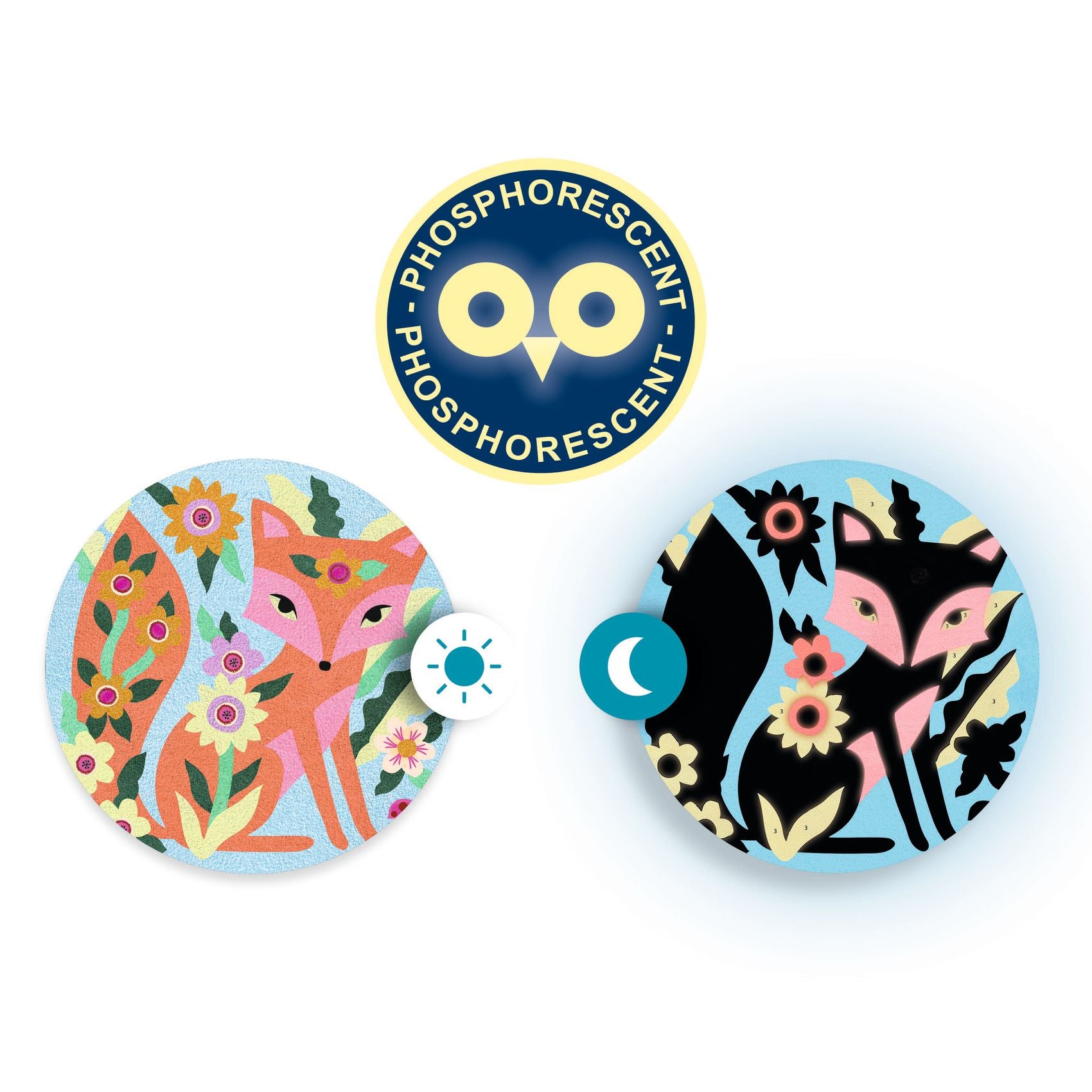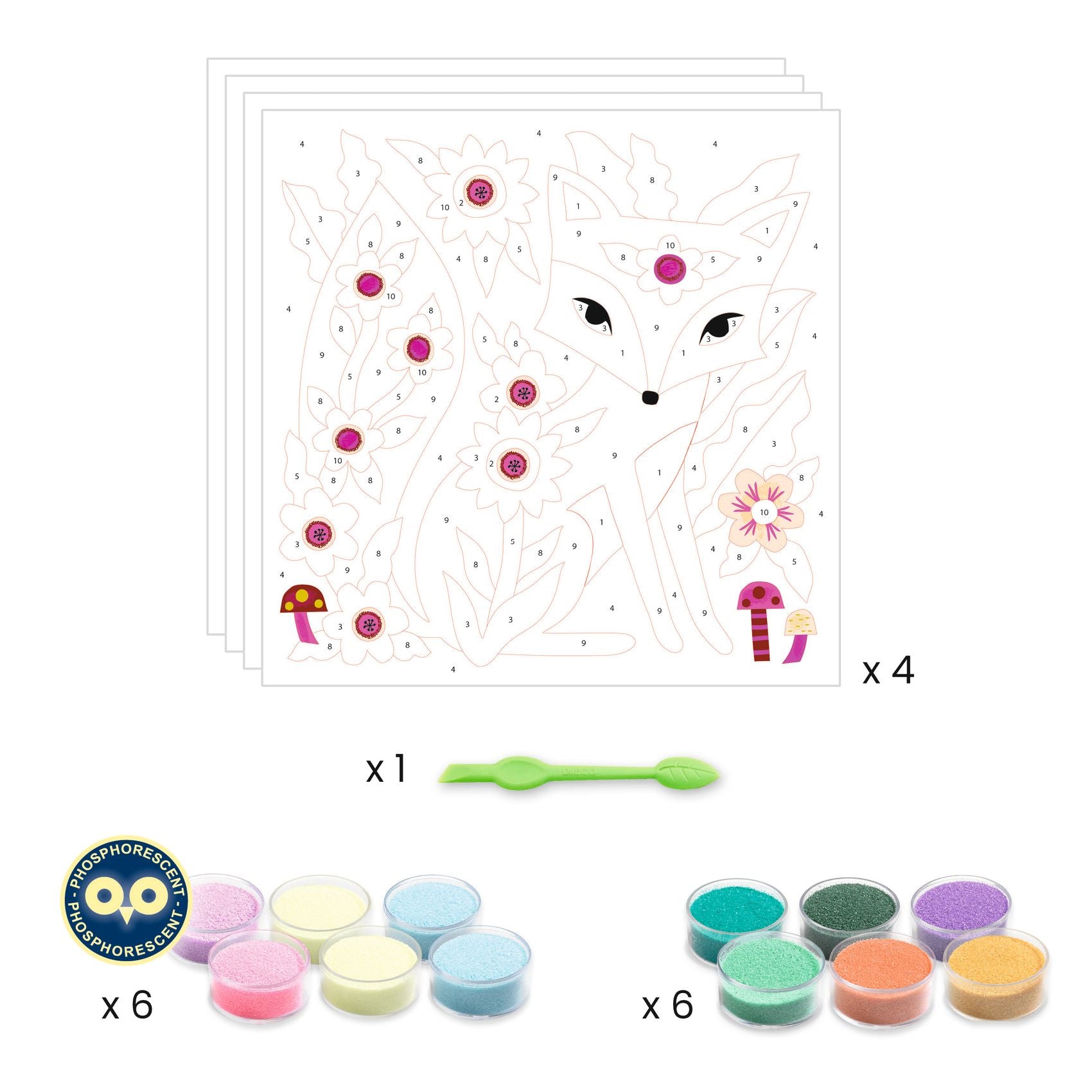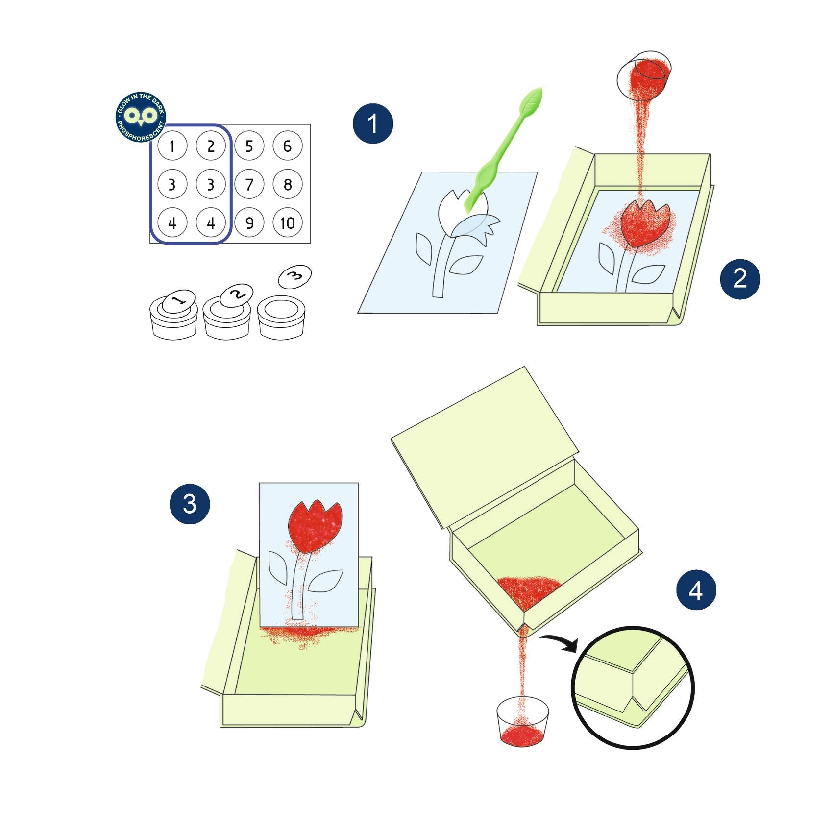 4 éjszakai állatokat bemutató festmény, amelyeket színes és foszforeszkáló homokkal kell színezni. A gyermek a festményét a dobozba helyezi, a mellékelt eszközzel feltárja az előre beillesztett területeket, majd a füzetben megadott színkódot követve homokkal szórja be azokat. Ha az elkészült festményeket a gyerekszoba polcára kiteszik, lesz meglepetés az esti órákban: az illusztrációk a sötétben világítanak! A sötétben világító homoknak köszönhetően a kerti élőlények a sötétben is láthatóak!