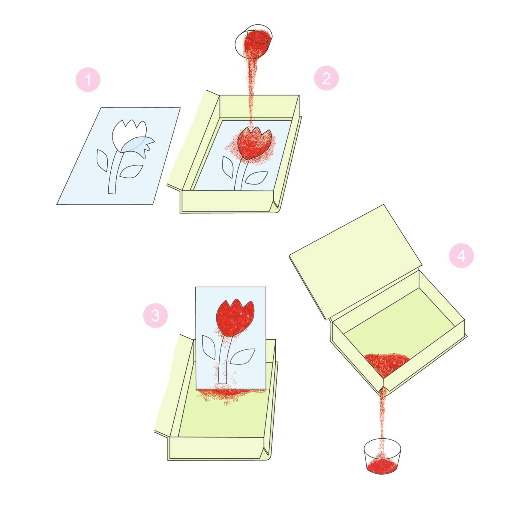 A rajzos útmutató segít, hogy gyönyörű madaras képeket készíthess a készlettel. Az alapról távolítsd el a megfelelő számozású képrészletet és szórd rá a megadott színű homokot vagy csillámotport! A színezőanyag beleragad a felületbe. A fennmaradó port töltsd vissza a tégelyébe! Jöhet a következő részlet. Érdekes megfigyelni, ahogy részletről részletre változik az alkotás.