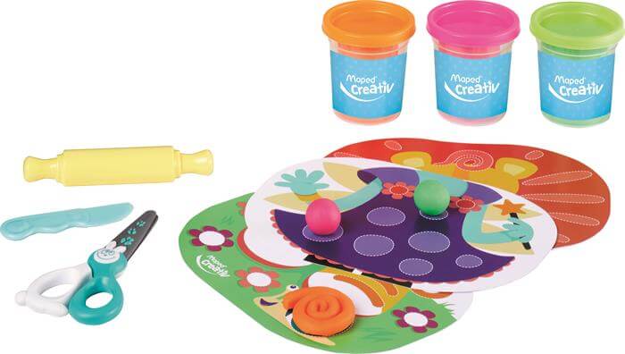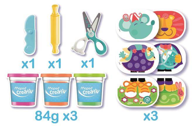 Készségfejlesztő gyurma készlet, hordozható kistáskában. Vágj, lapíts, gyúrj és készíts mókás figurákat a különböző színű gyurmákból! 2 éves kortól ajánlott. A doboz uzsonnástáskának is kiváló. A doboz tartalma: 3 tégely gyurma 3 db kétoldalas foglalkoztatólap kiegészítők: olló, nyújtófa, kés