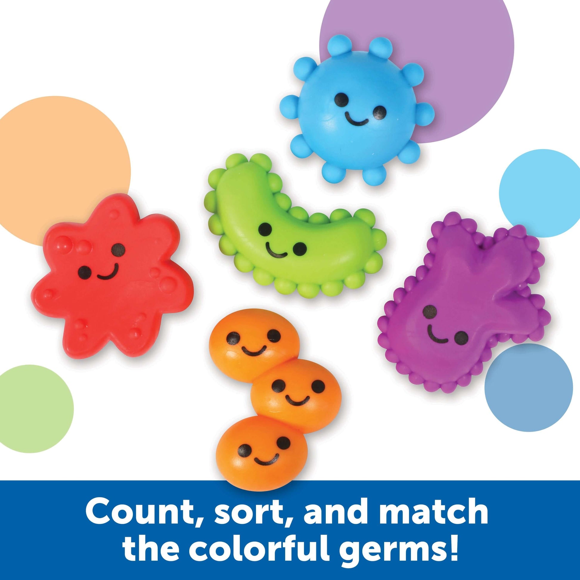 Ebben a készletben található kizárólagos finommotoros eszközök segítségével a gyerekek kiválaszthatják és szétválogathatják a puha bacikat 5 különböző formában és 5 élénk színben.